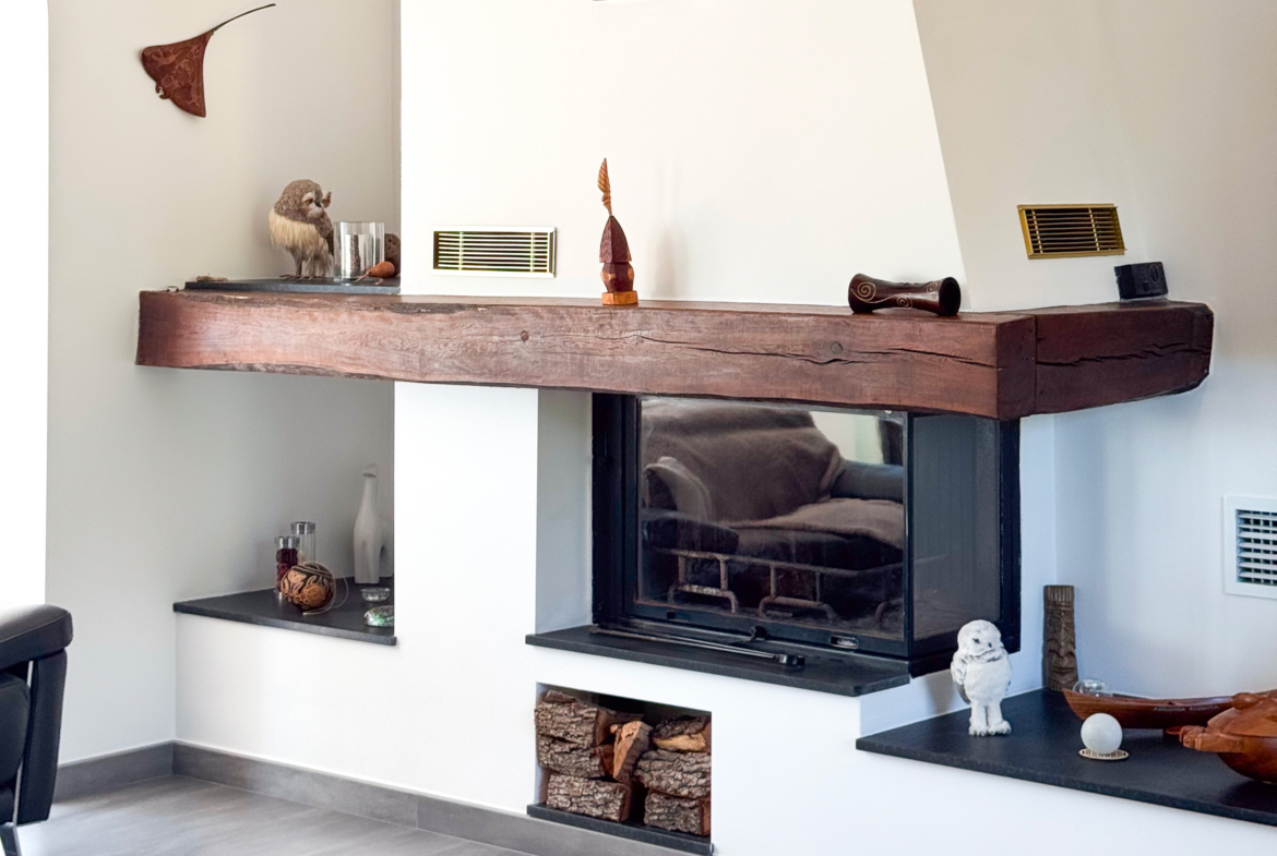 The house includes a comfortable living room with a fireplace, a separate kitchen, two bedrooms with bathrooms, and an additional small mezzanine bedroom.